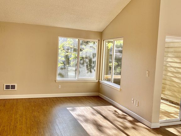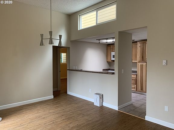 Quiet end unit, 1-level, 2 bed, 1 bath condo. High ceilings, Newer vinyl flooring, paint, kitchen and appliances. Bath offers shower with dual heads.Washer/dryer hookup. Back slider leads to private deck overlooking small stream. Extra storage unit, covered, assigned carport parking spot. RV parking, plenty of parking for guests. Backs to small park with basketball and tennis courts. Walking area for pets. Pool is seasonal. Old Willamette are is only about a mile walk.