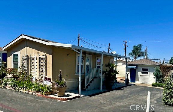 Beautiful, very well maintained home in 55+ community. Inviting open floorpan with plenty of room for entertaining. Light and bright home with large living and dining, kitchen with skylight and breakfast bar. Spacious bedroom and bath. Laundry room with desk area (Community laundry on-site as well). Covered side patio. Long driveway for parking. Large shed in back. Corner lot. Movie-in ready! Near beaches, shopping, restaurants. Come enjoy the ocean breezes from nearby Newport Beach.
