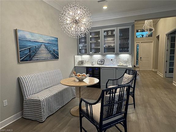PROFESSIONAL PHOTOS COMING SOON! Welcome to this stunning Chandon model, the most sought-after floor plan in Valencia Bonita—renowned for its vibrant lifestyle, resort-style amenities, and maintenance-free living. Perfectly positioned on a premium lakefront lot with a rare expansive side yard adjacent to open green space, this home offers privacy, luxury, and incredible sunset views. Step inside to a beautifully furnished interior in a coastal chic / Serena & Lily style. The home features upgraded flooring, crown molding, designer light fixtures, and custom-built closets throughout. Enjoy Florida living with full hurricane protection, including impact-resistant windows and doors, Storm Smart lanai screens, and a whole-house generator for peace of mind. The pool and spa boast a sun shelf, color-changing lights, and soothing water features, all surrounded by white travertine decking and panoramic screen enclosures that frame picture-perfect water views. The extended lanai is a true outdoor oasis, complete with a fully equipped outdoor kitchen, wall-mounted TV, and ample space to entertain. Inside, the built-in bar area features a new beverage refrigerator, while the screened front entry allows gentle breezes to flow through the home and provides a secure spot for package deliveries. The climate-controlled garage includes epoxy flooring, mini-split A/C, a custom storage system, insulated door and ceiling—ideal for the included GOLF CART. Community Features (Valencia Bonita): • 24/7 manned gate & security • Massive clubhouse with social hall • Resort-style pool with beach entry, lap lanes & hot tub • Poolside bar and restaurant • Full-service fitness center with aerobics & yoga studio • Multiple sports courts: pickleball, tennis, bocce • Grand social calendar: shows, concerts, clubs, and events • Dog park, walking trails, and more This is Florida living at its finest—luxurious, low-maintenance, and lifestyle-rich. Don’t miss the opportunity to own this move-in-ready, lakefront beauty in one of Bonita Springs’ most desirable 55+ communities.