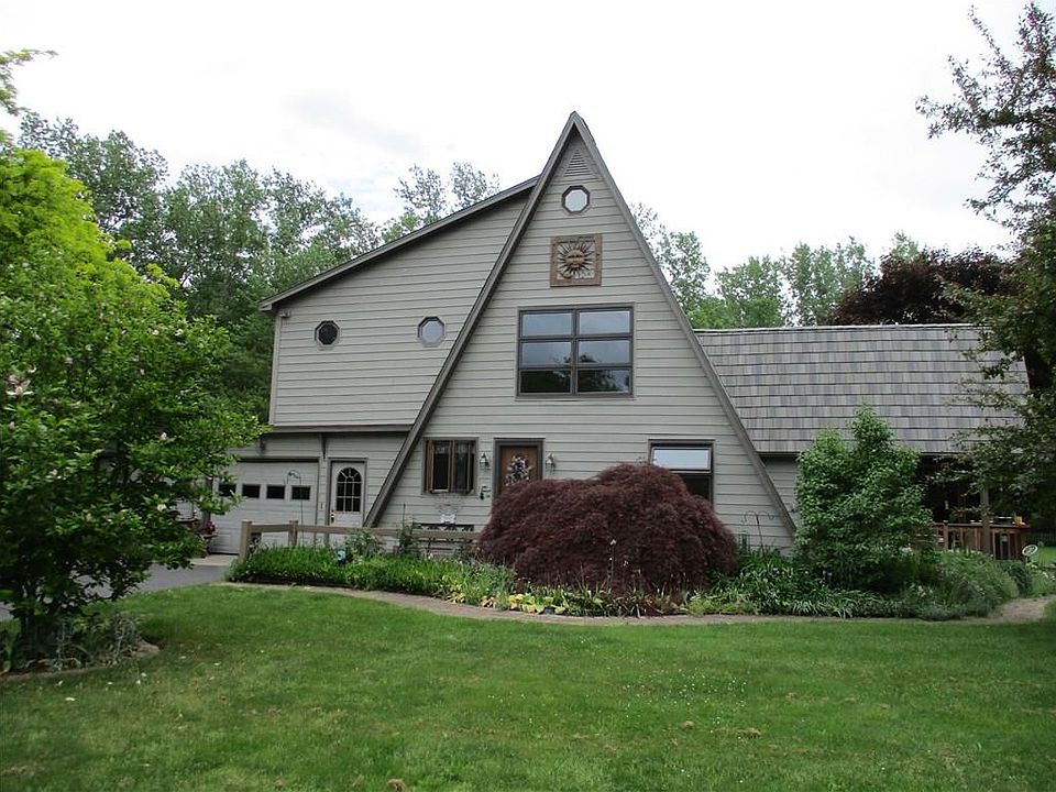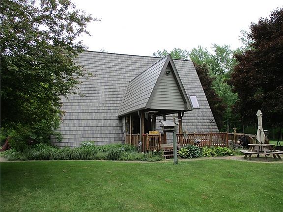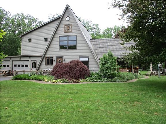 Great A Frame/ Contemporary situated on 20.5 private acres*Home sits well off road*Over 2000 square feet w/ 2-3 bedrooms, 3 bathrooms, great room w/ 17' vaulted ceiling, slider to one of three decks* Nice second floor loft area*Spacious master bedroom ( two walk in closets), master bathroom, second floor sun room with vaulted ceilings/skylights, and second floor deck area*Large basement craft room, and spacious workshop attached to back of garage*fenced dog run*Also detached 2 car garage for your extra toys* Also has a pond ( shallow), nice wooded area with trails cut thru* A wonderful country location*