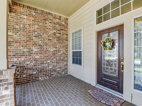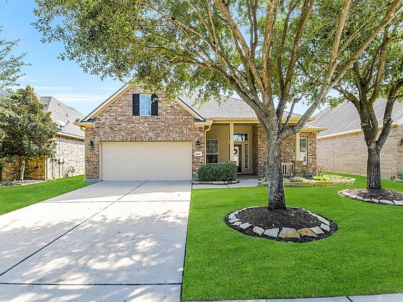 Peaceful location inside the private gated community of Winding Trails, just a short stroll to the walking trail and lake! New Roof 2025, Whole Home Water Softener System, Reverse Osmosis at Kitchen Sink. Charming covered front porch, all sides brick home. A classy Village Builders design with high ceilings and crown mouldings! Offering 2 primary bedrooms with 2 full bathrooms, plus a private study/library with double French doors and hardwood floor overlooking the front patio. Tile floors extend through the entry, dining and main living areas. Corner fireplace with stone surround. Island Kitchen offers granite counters, upgraded cabinets, deep walk-in pantry, gas cooktop. Recent new Bosch dishwasher. Butler's pantry between kitchen & dining room. Large Utility room with countertop, cabinets, space for extra fridge. East facing shady covered back patio. Private side courtyard. Well-maintained landscaping, full automatic sprinklers. Security System. Washer, Dryer, Refrigerator included!