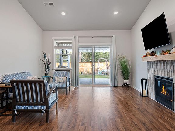 Welcome to this beautifully built 2022 Craftsman-style home, designed for low-maintenance vacation living or comfortable year-round residence. Bright and open, the floor plan features soaring vaulted ceilings and an expansive great room with oversized windows that fill the space with natural light. Rich plank-style laminate flooring flows throughout, complementing the home's thoughtful architectural details.