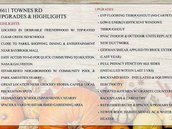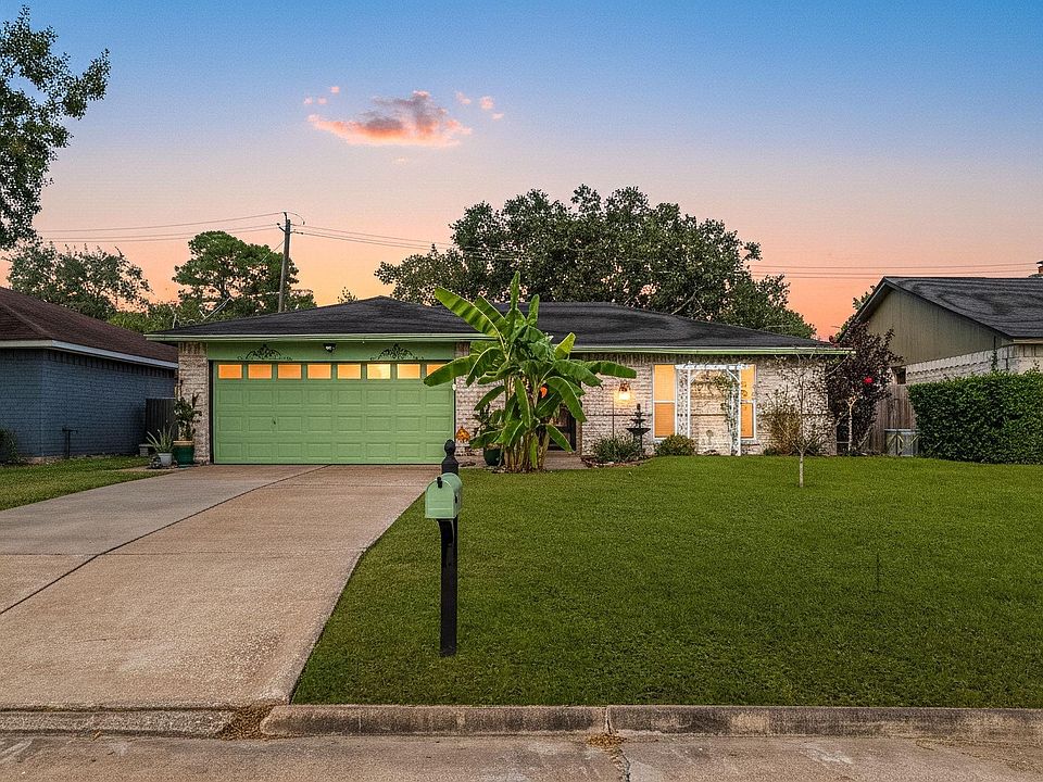 Brimming w/ undeniable charm this updated Friendswood home shines w/ thoughtful upgrades & a backyard built for relaxation! Inside you’ll find durable LVP flooring & Low-E windows throughout plus a bright open layout that blends style & comfort. The kitchen features granite counters & tile backsplash, while the spacious living area offers great natural light for everyday living or entertaining. Both baths are refreshed & the primary suite includes generous closet space. Major updates include a newer HVAC system w/ new ductwork, full privacy fence (installed within last 3 yrs) & German smear applied to exterior brick for a timeless look. The insulated backyard shed includes electricity—perfect for hobbies or storage. Enjoy a large yard w/ gardening space & a prime location near top-rated schools, shops, dining & freeway access. Zoned to Clear Creek ISD, this home delivers comfort, charm & convenience all in one!