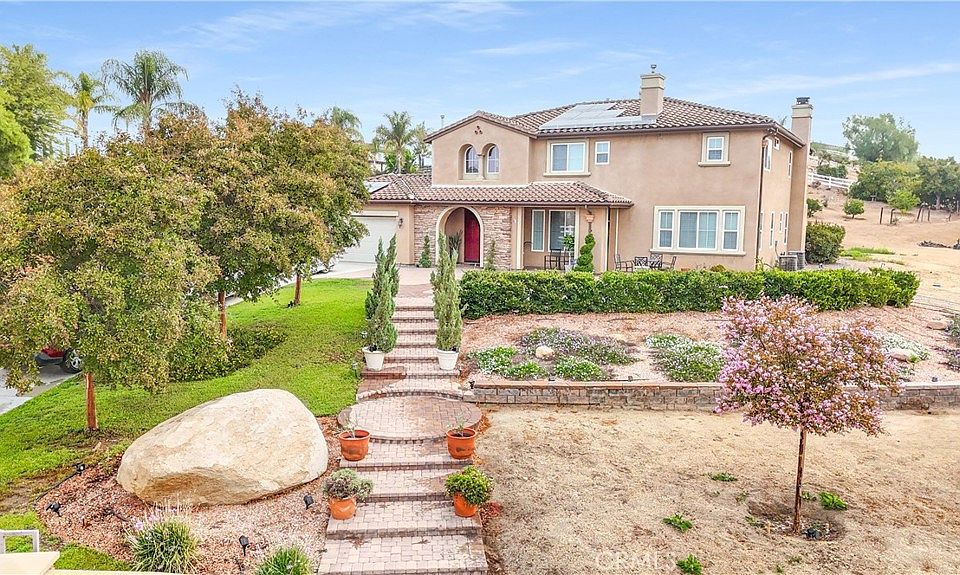 Welcome to 16612 Edge Gate Drive, a rare hillside retreat that offers the perfect balance of luxury living and natural serenity in one of Riverside’s most sought-after communities — Bridle Creek / Mockingbird Canyon. Tucked away on a private 1.37-acre elevated lot, this Mediterranean-style estate blends classic design, modern upgrades, and outdoor living into a peaceful, family-friendly oasis. From the moment you arrive, you’ll notice the grand curb appeal, framed by mature trees, sweeping driveway access, and expansive views of the surrounding hillsides. The home’s thoughtful architecture — with its arched windows and Spanish tile roofing — feels both timeless and welcoming. Step inside and you’re greeted with generous living spaces bathed in natural light, soaring ceilings, and fresh updates that enhance its elegance and functionality. With over 3,500 square feet of living space, the floor plan is designed to offer both openness and separation — perfect for multi-generational living, growing families, or entertaining on a grand scale. For nature lovers, the property is a dream: mature citrus and fruit trees, quiet trails, open skies, and even a custom play area for children that blends seamlessly into the landscape. Meanwhile, equestrian amenities, wide streets, and the lightly developed feel of the community give you room to breathe — all just minutes from the convenience of city life. If you're searching for a private, peaceful lifestyle without sacrificing comfort or proximity, 16612 Edge Gate Drive offers a unique and lasting opportunity to create your own legacy in the heart of Southern California.