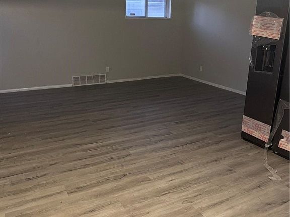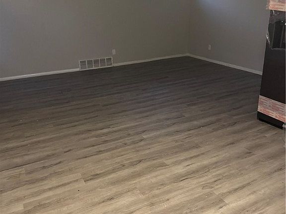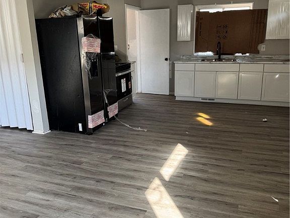 3-bedroom, 1.5 bath ranch with a modern open-concept layout combining kitchen and living areas. Neutral décor and luxury vinyl flooring throughout. Updates include new plumbing, renovated bathroom, and first-floor windows soon to be installed. Kitchen features black stainless steel appliances.