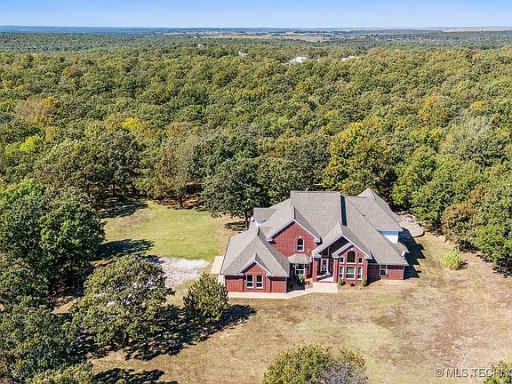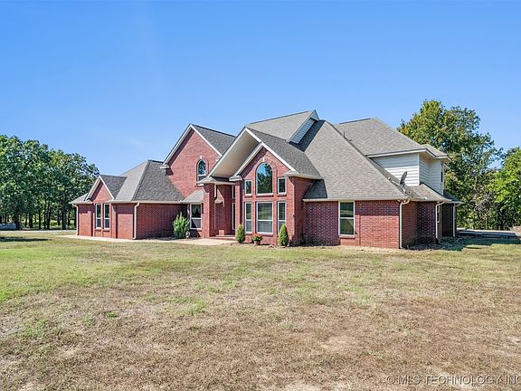 Enjoy peace, privacy, and space in this stunning 5-bedroom, 4.5-bath full brick home nestled among mature trees on a 2.48-acre lot. The open floor plan features soaring ceilings, oversized windows, and abundant natural light throughout. The spacious kitchen impresses with high ceilings, generous cabinetry, and an easy flow into the living and dining areas which are perfect for entertaining. A large concrete patio extends your living space outdoors, ideal for gatherings or quiet evenings surrounded by nature. Three bedrooms offer private en-suite baths, providing comfort and convenience for family or guests. Additional highlights include a dedicated office with built-in bookcase, a bonus room downstairs, and a formal dining area for special occasions. Located just minutes from Skiatook and beautiful Skiatook Lake, this home offers the perfect blend of tranquility and accessibility.