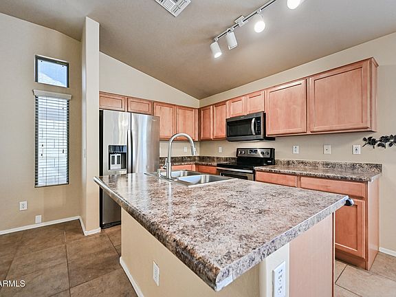 Adorable single level 3 bedroom 2 bath home with 2 car garage in a gated community with a sparkling pool! Walking distance to Pecos Park! Open living area has 9' ceilings. Lots of windows to let in the natural light. Open kitchen with stainless steel appliances and large kitchen island. Vinyl flooring in bedrooms. Primary bedroom has a private bath and walk in closet. The other 2 bedrooms share a full bathroom. This versatile floor plan can use the 3rd bedroom as an optional den with double doors that open to the living area. Low maintenance backyard is tastefully landscaped in rock. Tour Today!