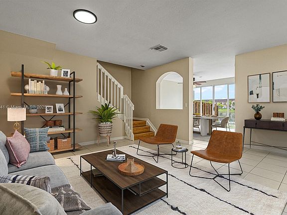 Welcome to Sunset Lake Townhomes in West Miami! This spacious 4-bedroom, 2.5-bathroom townhouse offers nearly 2,000 sq ft of living space and a desirable two-car garage. The interior has been freshly painted, features a new A/C, and boasts new luxury vinyl floors upstairs. The open floor plan connects to a private back patio with serene lake views, ideal for relaxing or entertaining. Upstairs, the bedrooms are generously sized, offering comfort and flexibility for today’s lifestyle. With its size, layout, and waterfront setting, this residence truly feels like a single-family home. To help visualize this home’s floor plan and to highlight its potential, virtual furnishings may have been added to photos found in this listing.