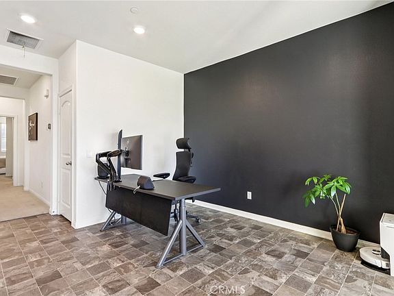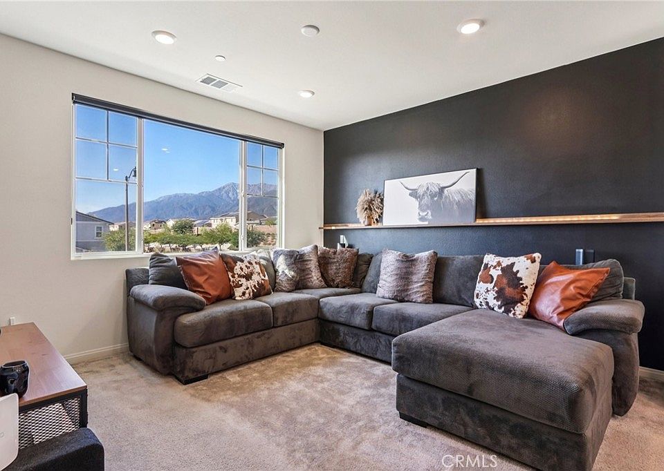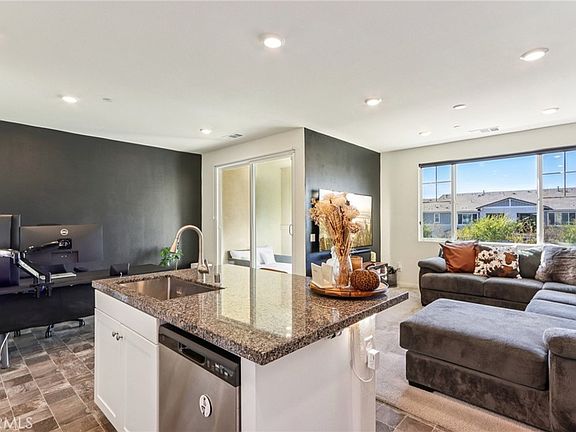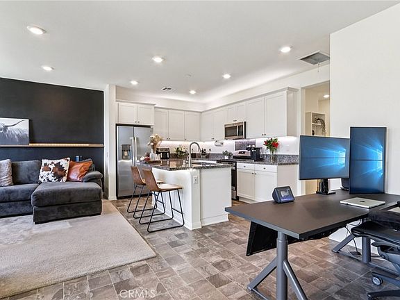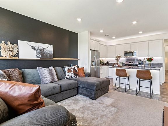Welcome to Gabion Ranch in North Fontana. This modern condo offers an elegant two-story residence with 1,392 square feet of designed living space. The bright and open floor plan includes 2 bedrooms and 2.5 bathrooms: a next-gen suite ground-floor bedroom with a full bath, built-in granite countertop with sink, and small refrigerator, and an upstairs primary suite featuring an en-suite bathroom with quartz countertops, dual sinks, and a walk-in closet, as well as an additional half bathroom on the upper level. The convenient, spacious laundry room is also located on the ground floor. The kitchen boasts a large island, granite countertops, and upgraded white cabinetry, connecting seamlessly to the open family and dining rooms. Interior highlights include: recessed lighting, smart custom blinds, Nest thermostat, decorative paint, vinyl, and carpet flooring throughout. Exterior amenities feature a private balcony and patio—perfect for outdoor dining and enjoying the breathtaking MOUNTAIN VIEWS. The home also includes leased Solar and a Ring Doorbell camera. The attached two-car tandem garage provides ample storage, parking, an EV charger, and a tankless water heater. Gabion Ranch is recognized as one of Fontana’s premier communities, offering residents access to clubhouses, fire pits, BBQ and picnic areas, swimming pools/spas, splash pad, sports courts, parks, playgrounds, and a dog park. Conveniently close to shopping, dining, and entertainment, and offers easy access to the 15 and 210 freeways. Make this exquisite home yours!