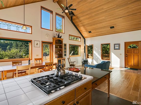 This custom craftsman was built by a cabinet maker & it shows. Sun-filled property just minutes from the village center with fruit trees, garden space, patio and quiet. Fine craftsman details from the soaring wood ceilings to the warm wood floors. Custom touches & walls of windows bring the outside in. A spacious master bedroom with en suite bath and deep walk-in closet plus 2 additional bedrooms provide generous living space for all. Detached 2-car garage currently in use as a dream wood shop.