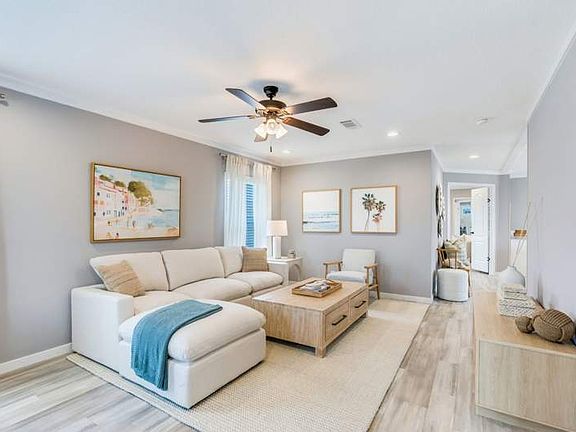 The Jasmine, a premier coastal cottage, designed by an award-winning team features a color-coordinated exterior with detailed board and batten, stone skirting, and custom lighting. A front porch and beautiful landscaping add charming curb appeal. Inside, the modern kitchen with stainless steel appliances lead into thoughtfully designed spaces, including a main bedroom with an en suite bathroom. Discover Osprey Bay-a brand new, vibrant 55+ community by the beach in Fort Myers. Filled with charming cottages, best-in-class amenities, and active programming, here mornings are spent at the resort-style pool or outdoor pavilion and afternoons by the water. Osprey Bay will offer incredible access to the best of Fort Myers. Perched nearby restaurants, retail, beaches, and water activities, days can easily be dialed up or down to your liking. A once in a lifetime opportunity to live in a coveted beach town community.*Model home starting prices subject to change*