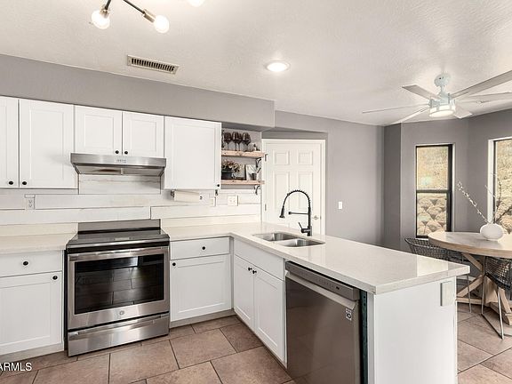 The remodeled kitchen is a showpiece with quartz countertops, designer backsplash, and a premium water softener with alkaline RO system. Upstairs, the primary suite is a true retreat, showcasing vaulted ceilings, a walk-in closet, and spa-inspired ensuite with jacuzzi tub. Additional bedrooms offer generous storage. Outdoors, nature surrounds you. The private backyard is designed for both relaxation and entertaining with a covered patio and fire pitperfect for Arizona sunsets under the stars. A 2-car garage with new garage door, water heater, and abundant storage adds to functionality