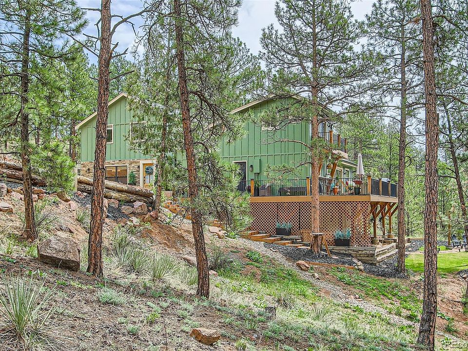 Experience the magic of mountain living in this exceptional custom retreat, where character, charm, and breathtaking views come together to create a truly unforgettable home! Tucked away in a peaceful neighborhood, this one-of-a-kind property is ideally located just 3/4 mile from the scenic Pine Valley Ranch Park, offering immediate access to a "mountain" of outdoor adventures. Whether your passion is hiking, mountain biking, fly fishing, snowshoeing, or simply enjoying miles of serene trails and picnic spots, nature is quite literally at your doorstep. Set on nearly 4 acres of gently rolling terrain with dramatic rock outcroppings and daily wildlife sightings, this property offers both tranquility and wonder. The 3281 sf residence includes not one, but two living areas-making it perfect for multi-generational living, hosting guests, or generating additional income. The main home welcomes you into a spacious, sunlit great room, where the kitchen, dining and living room flow seamlessly together - anchored by cozy window seats and a new gas fireplace. Step outside onto the expansive wraparound deck to soak in sweeping mountain views that will leave you speechless. Just a half level up are two generously sized bedrooms, each with vaulted ceilings and custom closets, separated by a full bathroom. Upstairs, the private primary suite features its own private deck, vaulted ceiling and a convenient attached bath. The walk-out basement is warm and welcoming, full of natural character, offering a charming family room, wet bar, private office, bedroom, an updated bathroom and laundry. The non-permitted attached ADU (Alternative Dwelling Unit) has been fully renovated and offers a large bonus room, bathroom, kitchen and laundry. The outdoor areas include, patios, fire pit areas, a barn and storage sheds. Whether you are seeking a private sanctuary, an investment property, or a place where adventure meets serenity, this remarkable mountain home is ready to welcome you!