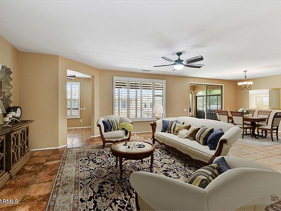 Welcome to The Grand! This well-cared for home awaits your personal touches. Features include new roofing underlayment 2025, OWNED Solar, updated HVAC 2017. An inviting gated patio with pavers reveals peek-a-boo mountain views. Ceramic tile flooring and wood shutters throughout. GE SS Profile appliances and a gas range for the cook. Laundry room includes a utility sink and cabinet storage. Bedrooms are split for privacy. The Arizona room is complete with a built-in gas grill station and doggy door. The exterior has been recently painted. Plenty of cabinets for garage storage. Irrigation lines and timer were replaced in 2024. Nothing to do but make it yours! Close proximity to Cimarron Golf and Clubhouse. Enjoy the amenities and all the activities The Grand lifestyle offers.