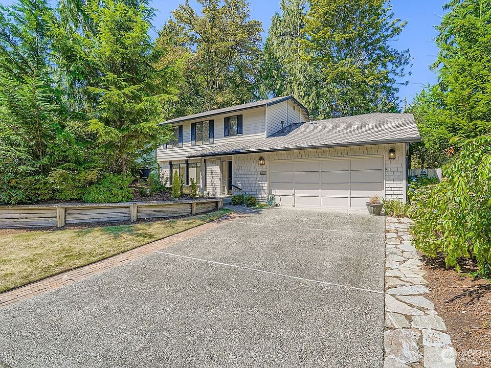 Brick patio gathering spaceSprawling backyardDark laminate floorsNew dishwasherUndermount sinkBlue cabinetsLight reflecting granite countertops