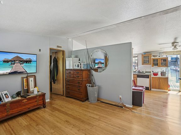 Float work recently completed by Harbor Services, Now Rated a 4 and fully Financeable! This single-level, three-bedroom, two-bath home offers a versatile layout with numerous options. The main bedroom features an en-suite bathroom, while the other two bedrooms are located on the opposite side of the house, ensuring privacy. The kitchen, living, and dining areas are centrally located, providing a cohesive living space. The generously sized swim float (16' x 30') can accommodate both dining and living sets, perfect for outdoor enjoyment. It also provides over 30' of open dock space for a boat or kayak/paddle board access.This property includes slip ownership at Jantzen Beach Moorage and boasts stunning views of the Columbia River. Priced to sell, this home offers an excellent and affordable opportunity for buyers looking to personalize and create a unique living space. Built in 2000 and placed on the float in 2001, the home has significant potential. Jantzen Beach Moorage is a gated community with strong security measures, ensuring peace of mind. Additionally, the property comes with two parking spots. Don't miss this unique opportunity to own a piece of serene waterfront living. This owned slip at JBMI (valued at around $100K), combined with a float rating of 4 and a spacious swim float, is available for just over $200,000 ? an incredible value for this complete package.