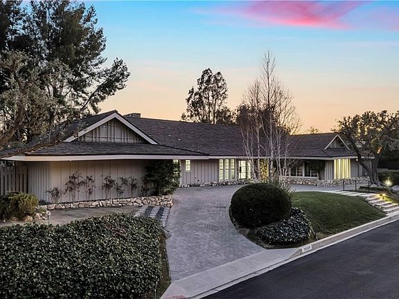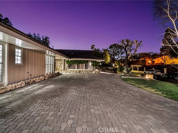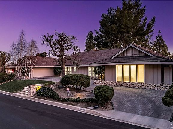 Welcome to this sprawling single-story estate located in the prestigious Knollwood Country Club. As you approach the home, the estate feel is immediately apparent, with a double interlocking paver driveway, mature landscaping, and wide streets leading to a beautifully landscaped lot. The grand entry, with its modern double French doors, opens to an expansive open-concept living area, highlighted by wall-to-wall windows that evoke a timeless mid-century aesthetic and frame stunning views of the backyard. The living, dining, and kitchen areas flow seamlessly together, all bathed in natural light. A striking 72-inch fireplace anchors the living room, complemented by sophisticated grey flooring throughout. The chef’s kitchen is a true masterpiece, featuring under-cabinet lighting that accentuates the beautiful quartz countertops with bold black veins and smooth waterfall edges. It is equipped with high-end JennAir stainless steel appliances, white gloss cabinetry with black hardware, and two Moen faucets, blending style with functionality. Adjacent to the kitchen is a convenient laundry room. Guests will be impressed by the elegant half bathroom, which showcases a floating quartzite vanity and Spanish grey tile accents. The versatile executive office space is customized with bespoke cabinetry, unique stonework on one wall, and tile flooring, making it an ideal work space. On the home’s east wing, three generously sized bedrooms await, two of which are en suite. The expansive primary suite is a true retreat, featuring three sliding doors that open to the backyard, providing direct access to the outdoor oasis. A large walk-in closet completes this private sanctuary. The luxurious primary bathroom is a serene space, with floor-to-wall white tiles, a step-down shower with gold fixtures, a floating vanity, and a free standing tub—creating an elegant white-and-gold aesthetic. The outdoor space is truly exceptional. Step outside to find a resort-style backyard, a raised Jacuzzi and a massive sparkling pool. A covered porch offers the perfect space for outdoor dining or relaxation, all while enjoying panoramic views of the lush landscaping and the first hole of the Knollwood Golf Course. Additional property features include two AC units and two water heaters. This remarkable home offers an unparalleled blend of comfort, style, and tranquility, delivering the ultimate living experience.