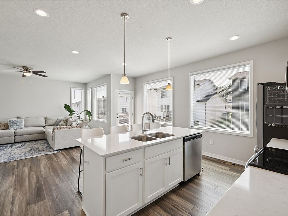 Discover the modern two-story plan designed for seamless living. Step onto the charming front porch and into an open floor plan where the kitchen, boasting abundant quartz counters, custom cabinetry and a central island, flows into the eat-in nook and family room. The main level also delivers a convenient drop zone and walk-in pantry. Upstairs, retreat to the spacious primary suite with double vanity, glass-enclosed shower and walk-in closet, alongside three additional bedrooms, a full bath and laundry room. Additional highlights include 2.5 baths, a 2-car attached garage, maintenance-free vinyl siding, passive radon mitigation, hard-surface flooring throughout most of the main level, and a full suite of appliances—washer, dryer, electric range, refrigerator, dishwasher and microwave—plus blinds on all primary windows. Experience comfort, style and functionality at its finest. Schedule your showing soon!