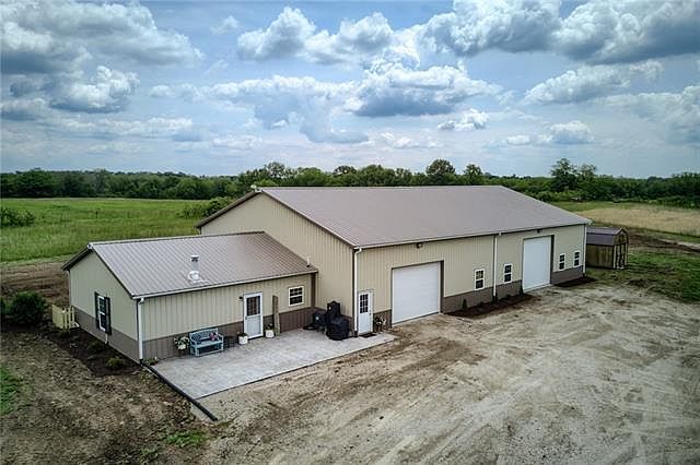 COUNTRY LIVING - Just Under 10 beautiful acres -- tree'd and secluded entrance Metal building includes 73x50 Shop area w/ 3 Insulated doors + Office. Finished Residence within the building boasts 2 BR/1 Bath at approximately 1200 sq feet. OPEN Concept for Living/Dining/Kitchen area. Wood-burning FP, Spacious walk-in closet in the Master BR. Large laundry room & pantry. Shared pond perfect for fishing. Potential to build a 2nd home while living on the premises. Buyer to verify requirements with County. Basehor-Linwood school district. Taxes and square footage is approximate, buyer to verify 2021-06-05