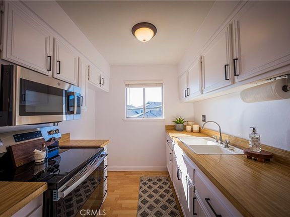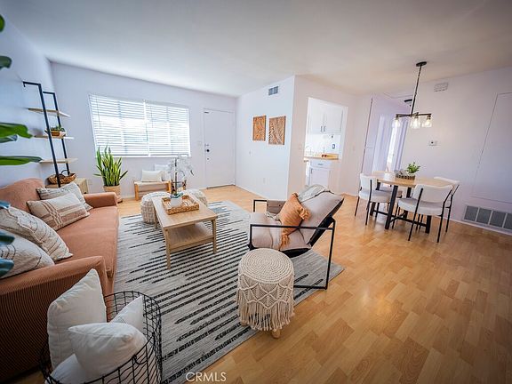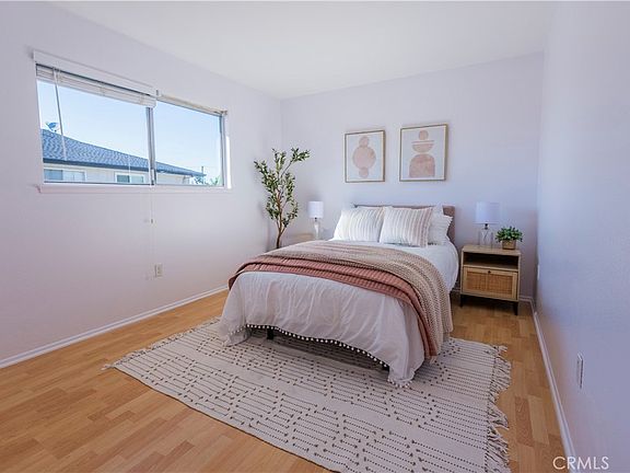 This charming upper-level 2-bedroom, 1-bath condo in the Huntington Gardens community is the perfect starter home. The unit features fresh paint, new light fixtures, laminate wood-like flooring, central heating, and a brand-new range and microwave. With the garage directly below, you'll have a dedicated parking space in a shared garage, along with convenient on-site community laundry. The home offers plenty of natural light, abundant storage, and views of the beautifully maintained community grounds, with additional open parking available for guests. Located in Huntington Beach with easy freeway access, the property is just a short drive to Huntington and Bolsa Chica State Beach, the popular Bella Terra shopping center, and other convenient shopping and dining options, as well as the wetlands. Reasonable HOA fees and FHA and VA approval make this home a wonderful opportunity.