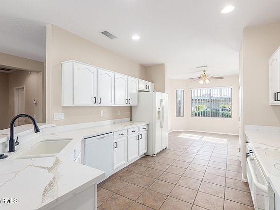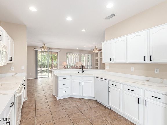 Immaculately maintained 3-bedroom home with a 3-car garage featuring abundant built-in cabinetry for storage, situated on a quiet cul-de-sac lot in Sun City Grand. This home offers an excellent open-concept floor plan with recessed lighting, a cozy fireplace in the great room, entertainment and décor niches, and sliding doors that lead to a private backyard retreat. Enjoy a covered patio, mature shade trees, and a built-in BBQ—perfect for outdoor living.