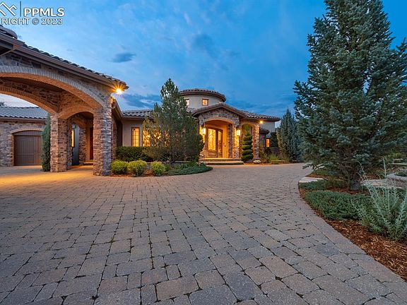 Exceptional Tuscan villa, nestled within the exclusive gated community of Village of Toscano, situated in the desirable Flying Horse community. This home is truly centrally located being just minutes from I-25, Highway 83 and in walking distance to the Club at Flying Horse, offering a fitness center, renowned spa, world class steak house, luxurious lodging options, indoor & outdoor pools, and two private golf courses. It also enjoys direct views of the Tom Weiskopf golf course. Indulge in unparalleled luxury within this five-bedroom masterpiece (three with access to outdoor decks), each boasting en suite bathrooms and walk-in closets. The primary suite redefines opulence with a private deck, two double-sided fireplaces, offering relaxation in the tub and state-of-the-art shower. With eight bathrooms, a spacious office featuring floor to ceiling bookcases, formal and eat-in dining areas, and over 1200 sqft of outdoor entertaining space, this home exudes elegance and comfort. The kitchen boasts with upgraded appliances is designed for entertaining, seamlessly flowing with the dining, formal dining and family room. Access to the outdoor kitchen and patio is available from all entertaining areas, enhancing the allure of indoor-outdoor living. The living room treats you to breathtaking views through its floor-to-ceiling windows. In the walk-out basement, the large family room sets the stage for relaxation and entertainment. Engage in friendly competition with a game of chess, experience pure relaxation in the sauna or maintain your well-being in the exercise area. Indulge in your passion for movies in the theater room, and enjoy the convenience of a wet bar, enhancing your entertaining experience. With a 3-car garage attached to the home and a 2-car detached garage connected by a porte-cochère, this property offers ample space for all your vehicles and storage needs. Discover refined luxury with thoughtful design. Enjoy a lifestyle of prestige and sophistication.