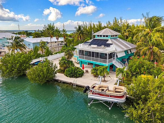 RARE Solar-Powered Waterfront Tropical Gem with TESLA Solar Storage Banks on Prestigious Sugarloaf Key! A rare opportunity to own a fully solar-powered waterfront residence featuring 26 solar panels and two Tesla Solar Powerwall storage banks, offering exceptionally low energy costs, backup power, and the potential to earn credits by supplying excess energy back to the grid. This elevated 3 BD, 2 BA, 1,764 SF home sits on exclusive Southpoint--only three homes from open water and just 20 minutes to Key West.Step inside to a breathtaking cathedral Cupola, soaring above the open living, dining, and great room. Impact-glass windows fill the space with natural light, highlighting the home's tropical architecture and warm coastal finishes. The kitchen is designed for effortless entertaining with a double island, stainless steel appliances, and new quartz countertops. The split floor plan creates exceptional privacy. The primary suite features a large walk-in shower, jacuzzi tub, double vanity, and a spacious walk-in closet that connects to a versatile laundry/fitness/office room--also home to the Tesla storage banks. The opposite wing offers two guest bedrooms and a dual-access bathroom with two private vanities. Enhance your waterfront lifestyle with an impressive concrete boat ramp for jet skis, boats, kayaks, and paddleboards, plus a newly installed 10,000 lb boat lift on a deep, wide, crystal-clear canal providing fast access to both the Gullf and Atlantic. The oversized 15,000 SF lot bursts with vibrant tropical landscaping and includes a newly completed tropical pool with natural rock feature. Enjoy sunset views and star-filled nights from the rooftop observation deck. Additional features include Andersen impact windows and sliding glass doors, low insurance costs, covered parking, and excellent storage below the home.A rare Keys offering combining sustainable energy, modern resilience, and luxurious waterfront living--an exceptional opportunity in today's market