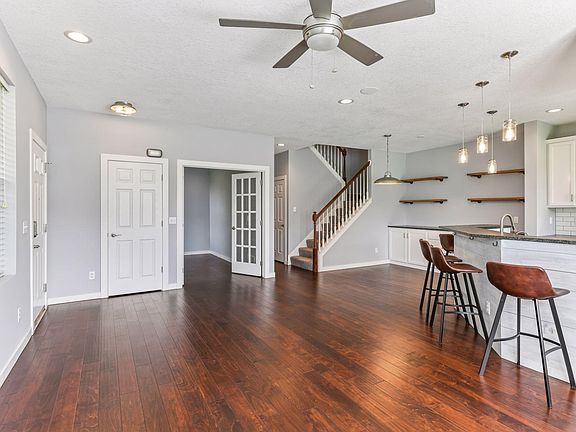 is an open concept sun filled living area overlooking large green space, 9 ft ceilings, hard wood floors. Main level office/den with glass French doors, half bath, storage closet and