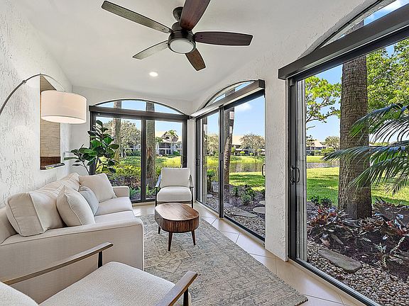 Enjoy serene lakefront views from this beautifully updated ground-floor 2-bedroom, 2-bathroom condo in the gated community of Jonathan's Landing. This light-filled residence has been thoughtfully updated and is being sold furnished, offering effortless move-in readiness. The patio has been enclosed and opened up, adding valuable extra square footage of living space while showcasing stunning water views. Features include impact windows, a new AC unit, a water filtration system, and an open & spacious floor plan. Additional highlights include a 1-car garage plus a separate golf cart garage - ideal for enjoying everything Jonathan's Landing has to offer with optional membership. Located in the heart of Jupiter minutes to the beach, restaurants, and shopping. Don't miss!