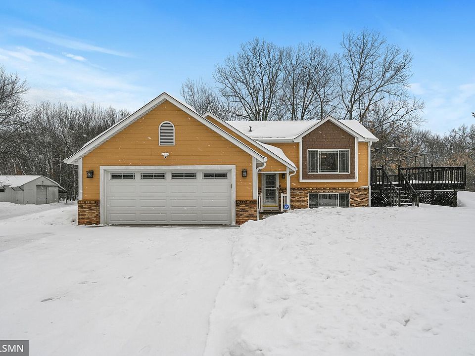 Only available due to a new opportunity! Welcome to this beautifully updated 5 bed/2 bath home situated on a private 4.6 acres. The upper level features 3 bedrooms, a full bath, updated kitchen and a living room with access out to a large deck. Lower level has 2 additional bedrooms, 3/4 bath and a large family room. With a 26x32 heated pole building, you can store all your recreational vehicles and toys or it would be perfect for a shop. Close proximity to shopping and quick commute to the cities. So many things to like about this property you will just have to see if for yourself!