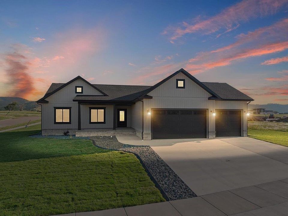 Listed by Kristin Buckmaster/The Real Estate Center of Spearfish. 605-639-1860 Welcome to this gorgeous new construction home nestled in one of Spearfish’s premier subdivisions. Surrounded by breathtaking views of the Black Hills, this thoughtfully designed property combines modern luxury with timeless style. Step inside to an inviting open-concept layout featuring hard surface flooring throughout, a tray ceiling in the living room, a cozy fireplace, and expansive windows that fill the space with natural light. The gourmet kitchen is sure to impress with sleek quartz countertops, a striking stone backsplash, and a full suite of included appliances. The basement is finished, providing additional living space that’s perfect for a family room, home gym, guest suite, or any other use that suits your needs. Outside, the home comes fully landscaped, making it truly move-in ready. Whether you're hosting guests or enjoying a quiet evening in, you'll appreciate the comfort, quality, and craftsmanship throughout. Don’t miss your opportunity to own a brand-new home in beautiful Spearfish, SD!