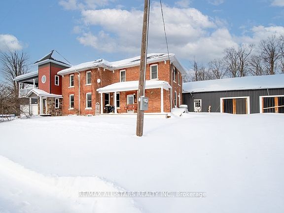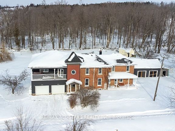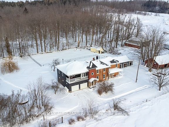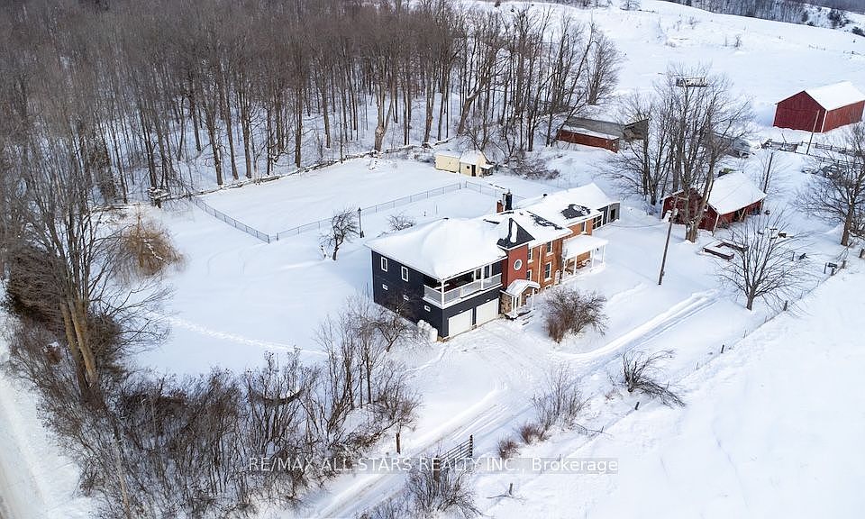 Country charm meets modern luxury in this exceptional brick century farmhouse, seamlessly blended with a stunning 4-year-old addition, offering over 3,500 sq ft of living space. The original farmhouse features a formal living room and dining room, while the expansive eat-in kitchen showcases a large island, new cabinetry with abundant storage, and a walk-in pantry. The main-floor family room impresses with cathedral ceilings, a wood-burning fireplace, and a walkout to a beautifully fenced in-ground pool-perfect for entertaining. A fully refinished century staircase leads to the second level, featuring four generous bedrooms plus a spectacular 22' x 13' primary suite complete with a walk-in closet, full ensuite, and private access to an upper-level balcony with hot tub and breathtaking countryside views. Additional second-floor highlights include a dedicated office, 4-piece bath, and convenient laundry. The property offers exceptional garage space with an oversized 2-car garage providing ample storage and direct access to a large mudroom, plus an additional attached 3-car garage with workshop. The property is serviced by a new septic system (2021), drilled well, 200-amp electrical panel (2022), and two propane furnaces with separate thermostats. All of this is set on a meticulously manicured 1.1-acre lot with spectacular panoramic country views. Quick access to Hwy 115 and 407 for easy commute to the GTA.