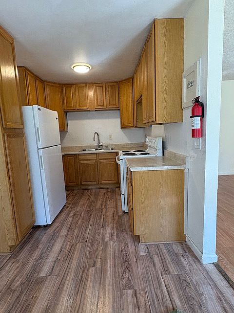 Brand-new refrigeratorAway from the streetAfternoon sunLaminate wood flooring