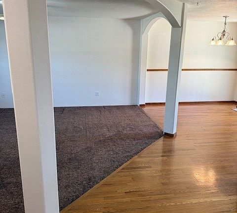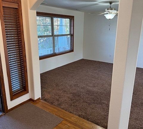 This well-maintained residence offers a spacious open floor plan designed for comfort and convenience. The entryway and kitchen feature wood flooring, while the living room, hallway, and bedrooms are fully carpeted. The primary suite includes a private bathroom with a walk-in closet.