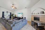Warm fireplaceOpen-concept kitchenCozy breakfast nookCustom tiled countertopsExpansive layout