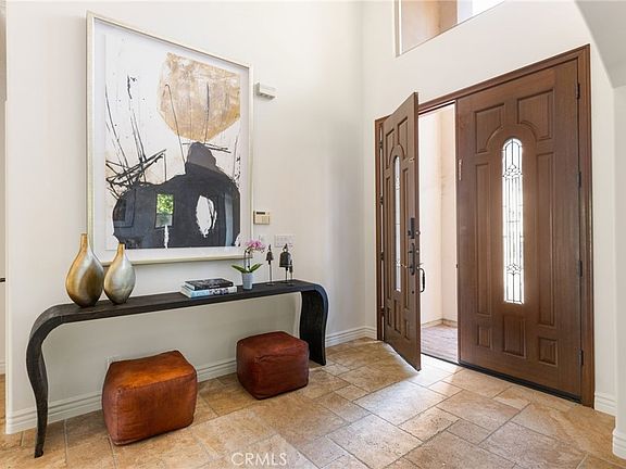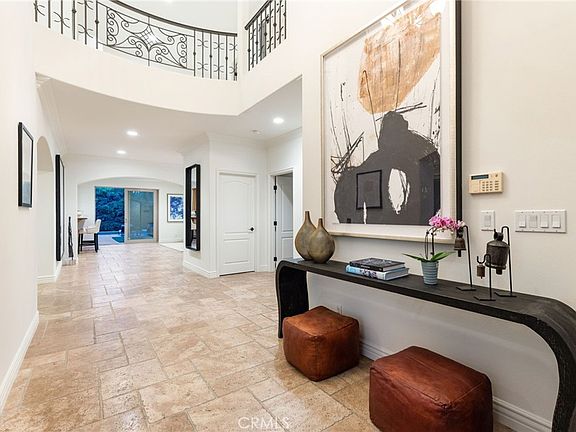 A dramatic double-height foyer with wrought iron accents and travertine floors sets the tone for the open, light-filled floor plan. Elegant formal living and dining rooms provide seamless flow for entertaining, while the spacious family room with fireplace opens through sliding glass doors to a lush, ultra-private backyard oasis. Outside, enjoy a sparkling pool, generous patio, and manicured grassy areas perfect for both grand gatherings and intimate relaxation. The gourmet chef's kitchen is a true centerpiece, featuring an oversized center island, stainless steel appliances, abundant cabinetry, and a sunlit breakfast nook. A versatile guest suite or home office with full bath completes the main level.