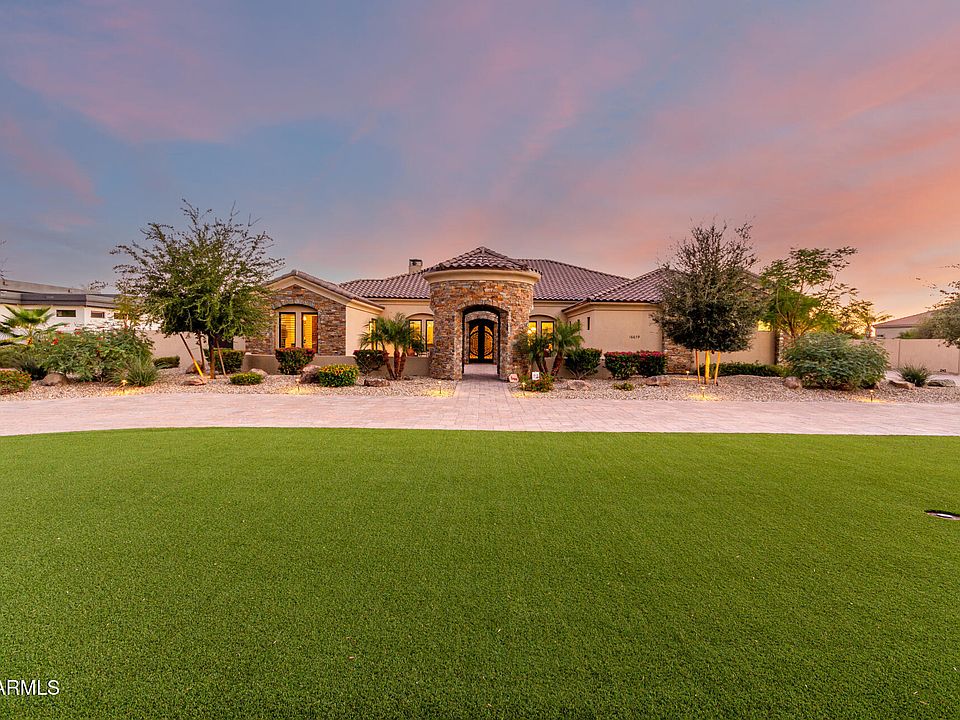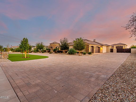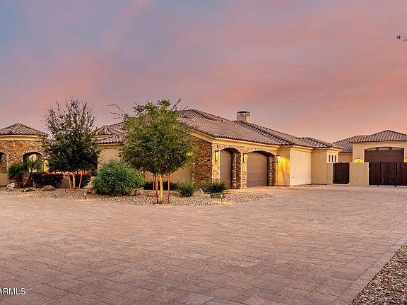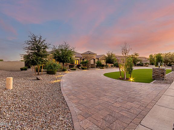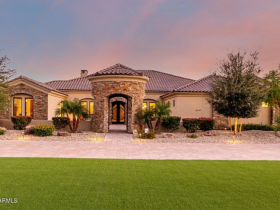 Experience elevated living in this exquisite 4 bed, 4.5 bath estate on over an acre in prestigious Sarival Gardens. Showcasing a refined stone-accented façade, tumbled paver driveway, artificial turf, and a circular drive leading to 8 garage spaces—including an air-conditioned RV garage. Enter through a custom double iron door into a grand interior with 12-ft ceilings, Italian tile floors, and a split layout featuring a custom bar, wine cellar, and chef's kitchen with Wolf/Sub-Zero appliances, quartzite counters, and dual islands. The lavish primary suite offers a stacked-stone fireplace, spa-inspired bath, and boutique-style closet. Enjoy seamless indoor-outdoor living with a resort-style backyard, complete with pool/spa, outdoor kitchen, fire features, and mountain views.