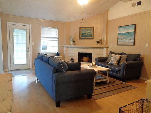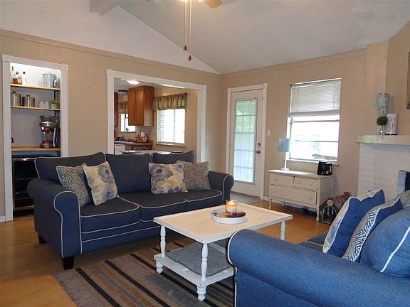 Check out this cozy, cutie pie situated on 2 lots! Vaulted ceilings in Living room with corner woodburning fireplace and light wood laminate flooring. 3 beds, hollywood-style 1.5 bath, office area or private computer nook. Kitchen has newer custom cabinets in kitchen and ALL appliances stay: range, built-in dishwasher and microwave, and refrigerator! There's even an extra fridge in the garage that sellers will leave for those additional beverages. Covered back patio, storage building on skids with extra loft area and recently updated sewer system per seller. Also, the property has recently had foundation stabilized July 2020. This one is affordable and ready for YOU!!