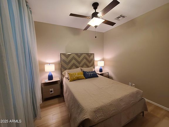 Discover this beautifully furnished 3 bed, 3 bath home with a versatile open office space perfect for work, hobbies, or additional lounge space. Thoughtfully designed and impeccably maintained, this home offers comfort, style, and functionality throughout. The layout includes a welcoming front bedroom with a queen bed, a spacious secondary bedroom with a queen bed and full ensuite bath, and a luxurious primary suite complete with a king bed, an expansive ensuite bath, and a large walk-in-closet. The heart of the home is a fully equipped chef-inspired kitchen with quartz countertops, a large center island, and all the essentials for everyday cooking. Adjacent is an open dining area with a table that seats six, and an inviting living room offering comfortable sofas, large flat screen TV, and an entertainment center with a built-in-fireplace. Step outside to a relaxing backyard retreat that includes a covered patio, a fire pit, and a charming pergola with an outdoor dining setperfect for enjoying Arizona evenings. Beautifully furnished and designed for comfort, this home is truly move-in ready and ideal for both short-term stays and long-term living!