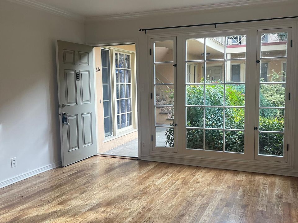 Welcome to Lyman Village in Los Feliz! This is a first floor 1 Bed, 1 Bath with hardwood floors throughout and tile in the bathroom. Large windows overlook the lush landscaped courtyard. Kitchen has plenty of cabinet space with built-in shelves and stainless steel counter tops. Appliances include a fridge and range. There is a small nook off of the kitchen which is perfect for a small table and chairs. There are two separate closets in the living room as well as a linen closet in the hallway. Bedroom also has a nice sized closet. Bathroom with tub/shower combo , pedestal sink and subway tile. Bedroom has a window a/c unit. Well maintained lush landscaping. Shared laundry onsite. One assigned parking space. Pet friendly under 35 pounds with additional deposit (breed restrictions apply). Our Lyman vacancies do not last very long so Contact us today to schedule a showing. We can also send you a short video of this unit. You can view all of our current vacancies on our website HollywoodHillsApts.com. One assigned parking space. Parking space may not accommodate larger vehicles. Landlord pays water and trash. Pet allowed under 35 pounds (breed restrictions apply) with additional security deposit.