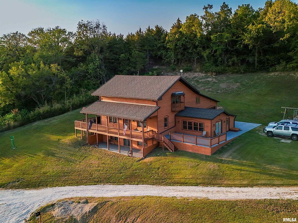 Welcome to one of Brown County’s most remarkable homes. A stunning six-bedroom, four-and-a-half-bath residence perched above the Illinois River Bottoms on 1.65 acres with breathtaking panoramic views. Spanning more than 4,700 square feet across three levels, this property blends rustic character with extensive modern updates and impeccable pride of ownership. The main level features open and inviting living and dining areas, a beautiful kitchen with an oversized island, and walkout access to multiple decks overlooking the countryside. Upstairs you’ll find a collection of beautifully finished bedrooms, including a spacious primary suite with private balcony and updated bath. The lower level offers warm wood finishes, a bar and game area, and walkout access to the patio — perfect for entertaining. Nearly every surface of this home has been improved: new 50-year steel roof, rebuilt decks, cedar siding restoration, refinished interiors, smart thermostats, upgraded water systems, and more. The insulated attached garage features a finished workspace and overhead storage. A true one-of-a-kind setting that captures the best of comfort, craftsmanship, and the incredible beauty of the Illinois River Valley. There is also a detached shed/outbuilding that will make for great additional storage or a great place to park vehicles or ATVs. There is additional ground (2.27 acres) adjacent to this home for purchase.