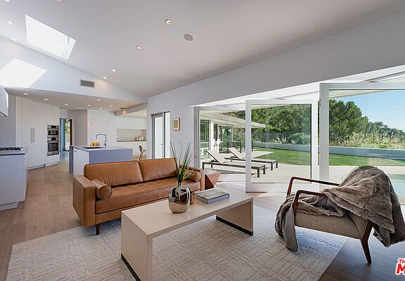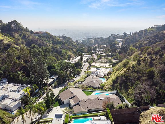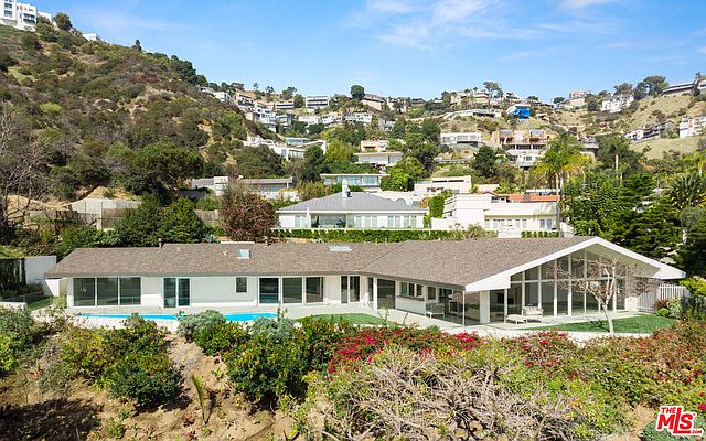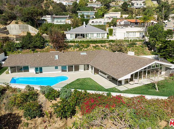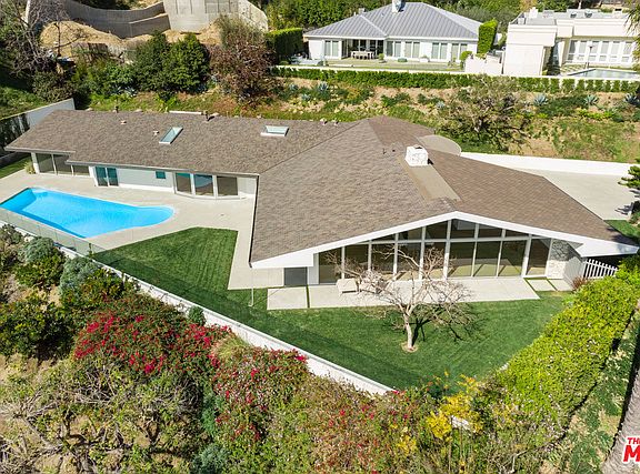 This iconic mid-century modern residence has been thoughtfully reimagined for the 21st century by internationally acclaimed architect Dan Brunn, AIA while maintaining its enduring mid-century appeal. Tucked behind gates off famed Sunset Plaza Drive, the home showcases bright, open living spaces with soaring ceilings, white oak floors, towering walls of glass and a distinctive, curved design. A soaring great room features a classic, double-sided stone fireplace and sliding glass doors to an outdoor dining area and bar with a pass-through window to the pool. Walls of glass line the open chef's kitchen, family room and master suite, fusing the spaces with an expansive, grassy yard and pool overlooking breathtaking jetliner views. An extraordinary example of mid-century design reinterpreted by one of Architectural Digest's Top 10 Rising Stars, this ultra-private celebrity enclave embodies the inimitable Hollywood Hills lifestyle with cinematic allure.
