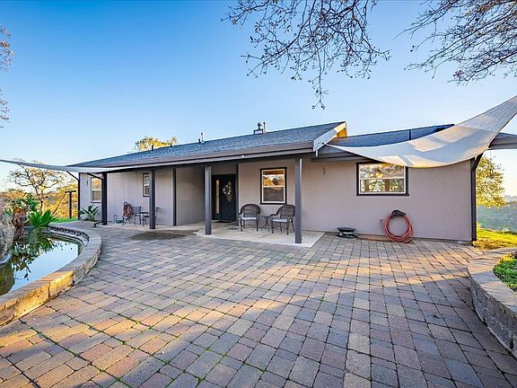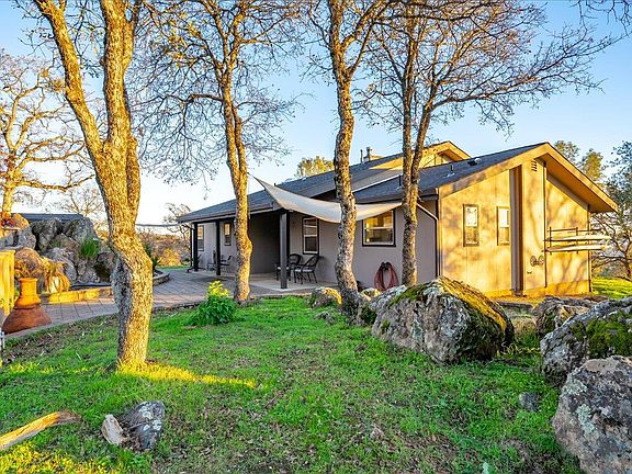 If you crave Privacy, Power Independence, and AMAZING PANORAMIC VIEWS, this updated 2-3 bedroom +office, custom home is calling. Built in 2011 and set atop 10 rolling, oak-studded acres, this home captures sweeping vistas of local ridges, and distant mountain ranges. Enjoy peaceful mornings and beautiful sunsets from the front courtyard patio with cascading waterfalls into a koi pond, and from the rear covered composite deck. Inside, the home features vaulted open-beam ceilings, new flooring/baseboards, fresh interior & exterior paint. The upgraded kitchen offers a newer sink, stovetop and oven, island, and walk-in pantry. Both bathrooms have new vanities. A professionally designed OFF-GRID system includes solar with 48 volt battery bank and a serviced backup generator. Three mini-splits provide efficient climate control. Additional features to enhance sustainable living include: Chicken Coop, 30-amp RV hookup, detached workshop with finished bonus room, shipping container, woodshed. Fenced garden with several fruit trees (Granny Smith & Honeycrisp apples, persimmon, lime, lemon, mandarin, peach, nectarine, cherries, and pluots). Approx. 10 scenic miles to shopping and services.