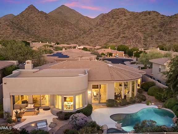 Perched on an elevated lot in private gated community of Trovas, this McDowell Mountain Ranch home showcases views of the McDowell Mountains, city lights, & vibrant AZ sunsets. 3 BR's + Office and 3.5 Baths with SOARING CEILINGS and Floor-to-ceiling windows in the living room that fill the home w/ an abundance of natural light, creating a bright & airy ambiance. The chef's eat-in kitchen opens to the family room with gas cooktop, double ovens, granite countertops, walk-in pantry & a spacious island perfect for entertaining. The primary retreat offers a spa-inspired bath w/ a soaking tub, a walk-in shower, dual vanities, and a generous walk-in closet. The RESORT- LIKE back yard with heated pool, & spa, built-in BBQ, cozy fireplace & covered patio creates the ultimate desert escape! WOW! Award-winning McDowell Mountain Ranch is a premier master-planned community located in North Scottsdale. Situated at the foothills of the McDowell Mountains, enjoy the beautiful desert serenity yet also have all the conveniences of living "in-town" just outside the neighborhood. The 101 Freeway is 5 minutes away, as well as restaurants, shopping, groceries, and so much more!