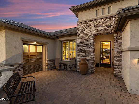 Prepare to be pleased with this ever so popular Treviso model home!! Situated on the 17th fairway of the West Course, the amazing views of the course, White Tank Mountains and water can be enjoyed floating in your pool with water feature and surrounded by Travertine decking or lounging on the extended covered patio!