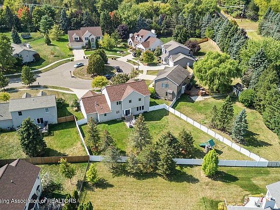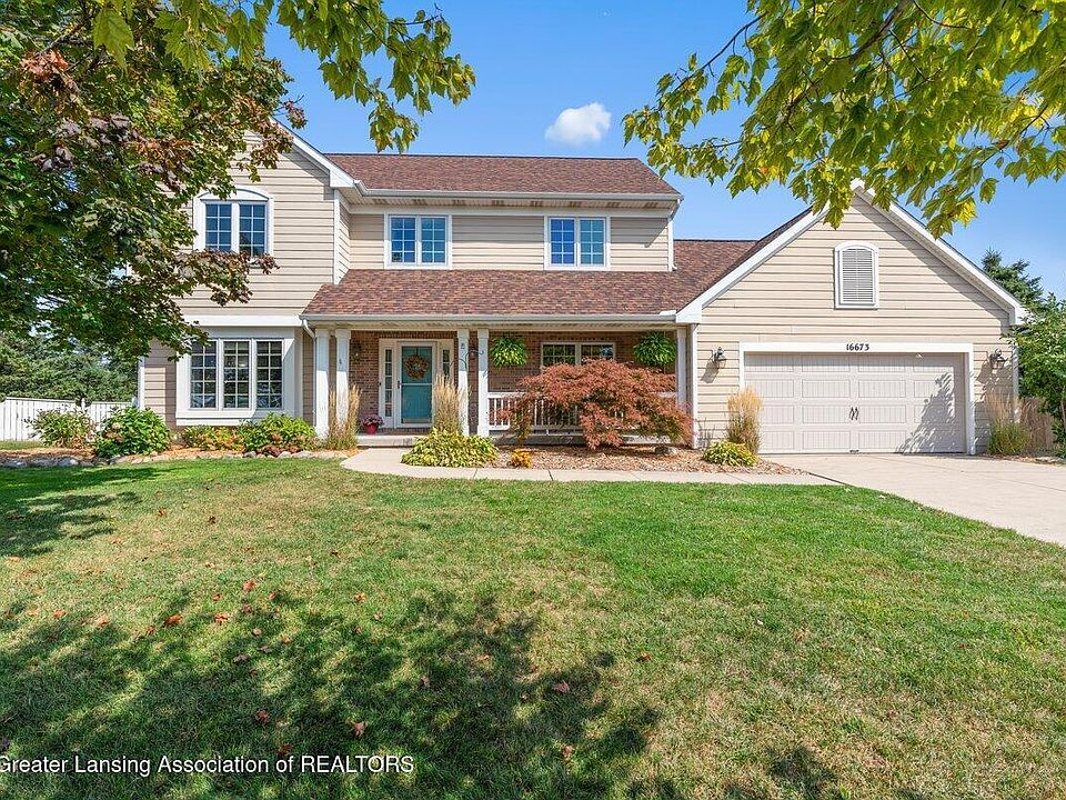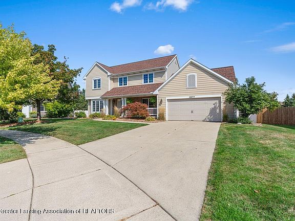 Welcome HOME to 16673 Sundew Circle! Located on a quiet cul-de-sac in The Meadows neighborhood, enjoy the award-winning Haslett School District with LOW Bath Township taxes. With 4 bedrooms and 2.5 baths, this home boasts over 3,000 square feet of living space. The main floor features a formal dining room, spacious office with double doors, cozy living room with a gas fireplace and built-in bookshelves, and a kitchen with plenty of cabinet storage and newer stainless steel appliances. The laundry room is tucked away on the main level making it a convenient mudroom space as well. Upstairs includes four bedrooms, one of which is the incredibly spacious primary bedroom suite with a newly refreshed attached bathroom featuring double sinks, a walk-in shower and a walk-in closet. The three additional bedrooms are all spacious in size with ample closet space. The second full bathroom located in the upstairs hallway features a gorgeous tiled shower. In the basement you will find over 800 square feet of additional entertainment space, and an egress window for ample natural light. Off the kitchen are newly built steps leading out to the backyard patio space ~ perfect for enjoying a family BBQ or your morning coffee! The back yard is completely fenced in with a vinyl privacy fence. Additional upgrades include a newer roof (2021), newer furnace & A/C (2015), newer high-efficiency hot water heater (2022), and more. The neighborhood features a park with playground, full basketball court, and soccer nets for residents to enjoy. Call today for a personal tour!