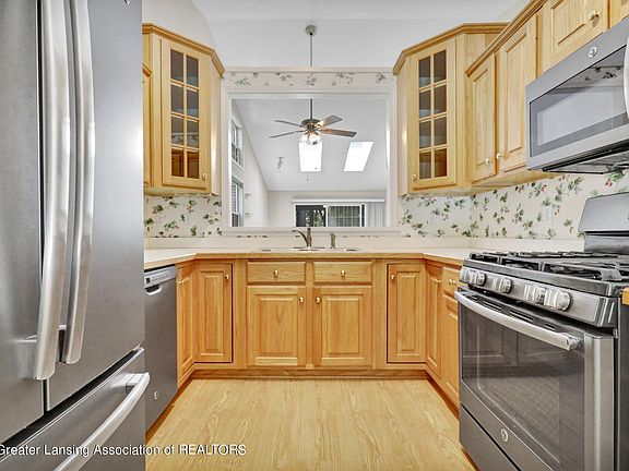 Welcome to The Pines Condos, where this charming 2-bedroom, 2-bath condo awaits you. Nestled in a serene wooded setting, this home offers modern comforts and a prime location. Enjoy cooking with new GE slate appliances. Relax in the spacious living room with a cozy gas fireplace, or savor your morning coffee and newspaper in the delightful breakfast nook. The condo boasts two spacious bedrooms and the convenience of a first-floor laundry. Step out into the inviting three-season room off the living room for a tranquil retreat. Located within the desirable Haslett School District and benefiting from low Bath Township taxes, this home combines the best of both worlds. Don't miss this opportunity to experience comfortable living in a beautiful, natural setting.
