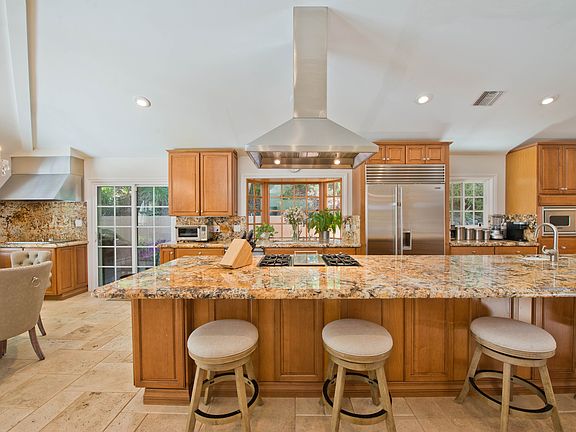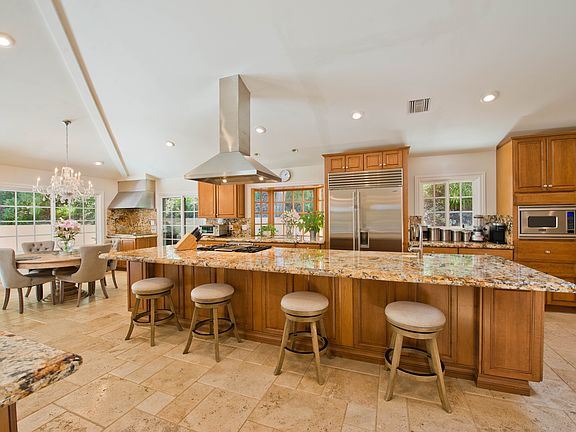 Anchoring the home is the amazing and huge chef's kitchen with oversized center island, massive breakfast bar, casual dining area and elegant custom oak cabinetry. Outfitted with top-of-the-line Viking and Sub-Zero appliances that include dual ovens, built-in refrigeration, microwave, center cooktop with griddle and indoor BBQ as well as a central entertainers bar with wine fridge.