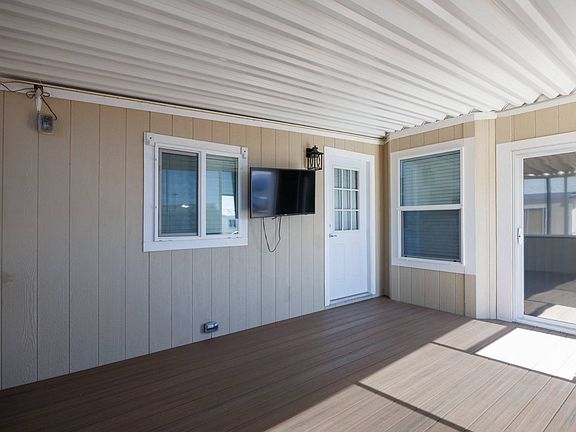 Beautifully updated 2020 Champion Park Model in a desirable 55+ community. This 1-bedroom, 1-bath home features vinyl flooring throughout, a spacious 15x16 Arizona room with two closets, and a remodeled 10x15 shed with washer and dryer, epoxy flooring, insulation, new sink, and custom cabinetry. Kitchen updates in 2024 include painted cabinets, pullout shelving, new faucet, subway tile backsplash, and modern lighting.Enjoy outdoor living on the partially enclosed deck with mounted 42" Smart TV. Additional features include RO system, sunscreens, and more. Large lot with ample parking. Move-in ready and well maintained!