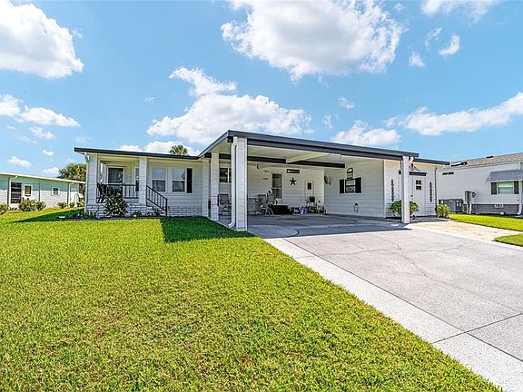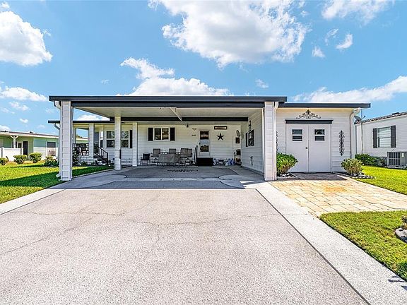 Selling BEAUTIFUL SUNSETS! Sitting high above the other homes, this Palm Harbor home has no backyard neighbors in HILLTOP ESTATES. Come see this PRISTINE, well-loved and cared for 2 bedroom, 2 bathroom home on a large lot. The ROOF was replaced in 2017, NEW HVAC 2025, NEW WATER HEATER 2025, NEW Vapor Barrier (top & bottom) and Insulation 2025, New TREX Front Porch 2025, Double Pane Windows, UPDATED Bathrooms, a walk-in Kitchen Pantry and a transferrable Termite Bond! The Double Car Carport measures 20 x 24 with a Breezeway between the home and the 14 x 12 Storage Shed with washer/dryer hookups, a utility sink and GOLF CART Parking. This home has a walk-through office and a lovely LANAI under HEAT & AIR (an additional 252 square feet). You can enjoy the 13 x 19 open backyard patio as well. Perfectly located behind the Clubhouse where you will find the Pool, Jacuzzi, Shuffleboard & Pickleball courts. There is also a Community RV/Boat Storage Lot. ***NO BONDS, NO CDD FEES*** The HOA is only $130/month and covers water, sewer and garbage. HILLTOP ESTATES is within walking distance to the VA Clinic, Doctor's Offices, Publix Grocery Store, Gas Stations and The Villages, just off State Road 42. For Boating and Fishing enthusiasts you can enjoy Lake Weir just 5 minutes East. Travel to the airport and attractions is a mere 1 hour and 20 minutes south and it is an easy drive to both coasts. Seller is offering a 1-Year Broward Factory Service Home Warranty. Call today to make an appointment to see this wonderful home.